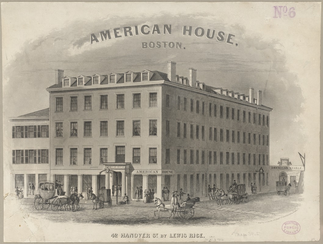 Operated by Lewis Rice, the hotel is located on today’s City Hall Plaza (then 56 Hanover Street). The first hotel in the U.S. with a passenger elevator, it subsequently expands to include a number of adjacent hotels and is enlarged to 200 rooms in 1851. Guests include John Brown. It is replaced by a new building in 1871.*
