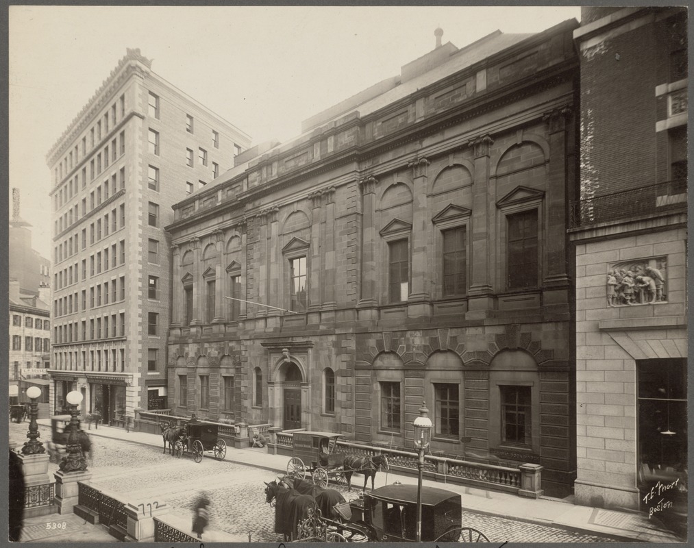 Architect: Edward Cabot. Designed in the Renaissance Revival style and modeled after the Palazzo da Porta Festa in Vicenza, it opens in July at 10 ½ Beacon Street. The cornerstone was laid on April 27, 1847. The oldest private library in the U.S., David McCord calls it “A kind of Utopia for books [that] combines the best elements of the Bodleian, Monticello, the frigate Constitution, a greenhouse and an old New England sitting room. The reader, the scholar, the browser, the borrower is king.” According to Walter Muir Whitehill, only the address appears on the front door because of “The general Boston assumption that anyone with serious business knows where things are; those who do not should inform themselves by other means than gaping at signs.” Proprietors are limited to 1,049 in 1854. The building is renovated and two floors added by Bigelow & Wadsworth in 1915, and renovated and expanded by Schwartz/Silver Architects in 2002 and Annum Architects in 2022.