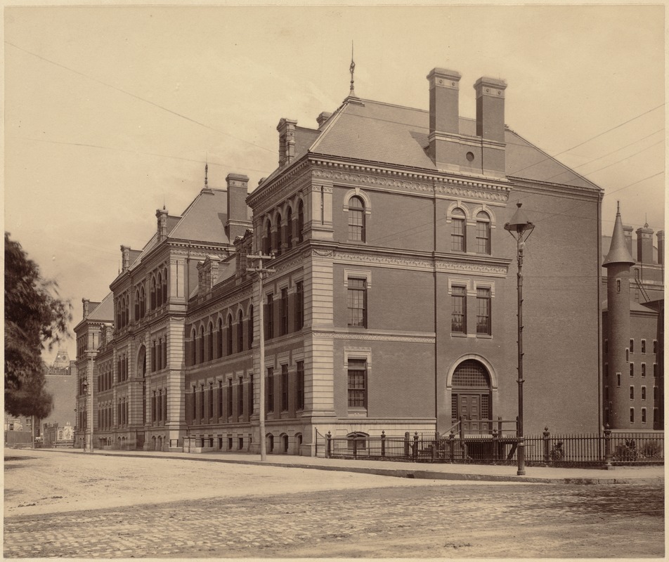 Architect: George Clough. It is located at 90 Warren Avenue. Also home to English High School, it opens on March 1, 1881, and is subsequently described as “the largest (building) in the world used as a free public school.” Latin School moves to a new building (seventh) in the Fenway in 1922.* The Montgomery Street building is demolished and another school is built on the site in 1958.*