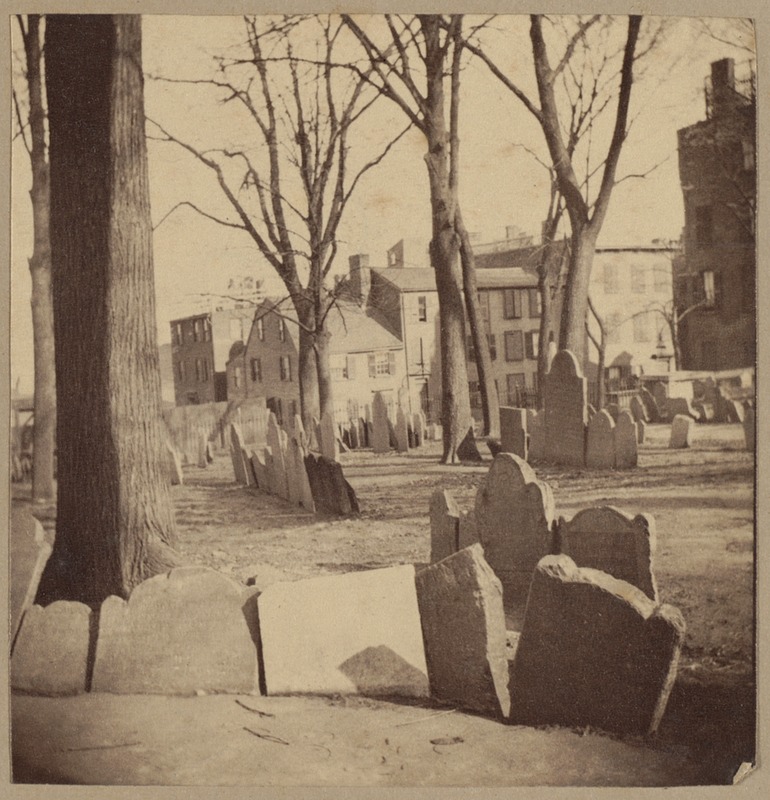 It is located between today’s Hull Street, Snowhill Street, and Charter Street. The second oldest cemetery in Boston, its graves include those of John and Andrew Eliot, Prince Hall, shipbuilder Edmund Hartt, Cotton, Increase and Samuel Mather, and church sextant Robert Newman. Other notable graves include those the unmarked graves of John White Webster, the murderer of George Parkman, and of a number of African-American residents of the nearby area known as “New Guinea.” The epitaph on the tombstone of Colonial Capt. Daniel Malcom is scarred by the marks of bullets fired by vengeful British soldiers. The cemetery is reorganized and headstones repositioned in rows (although not necessarily above the graves they mark) in the 1830s.