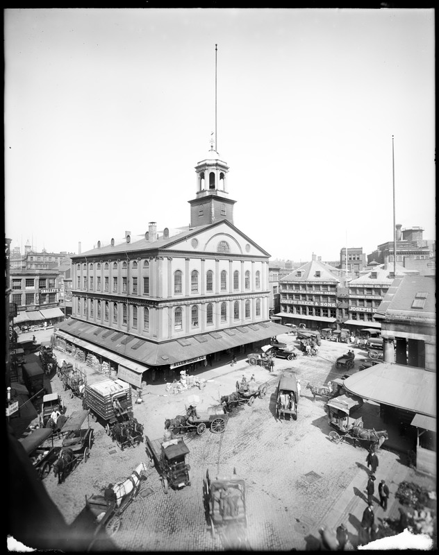 Architect: Charles Bulfinch. Extensively renovated, the building is twice the size of the original, now made of brick, and includes an additional third floor, and the cupola moved to the harbor end. The combination of an upstairs public meeting place with a ground floor public market leads Francis Hatch to write, “Here orators / In ages past / Have mounted their attack / Undaunted by proximity / Of sausage on the rack.” Charles Bulfinch slips on the icy steps of the building in 1813, breaks his leg, and is lame for the rest of his life. Several city offices are located here between 1841-1863. The building is damaged by fire on January 27, 1862. It is renovated and restored a number of times during the years, most recently in 1992.