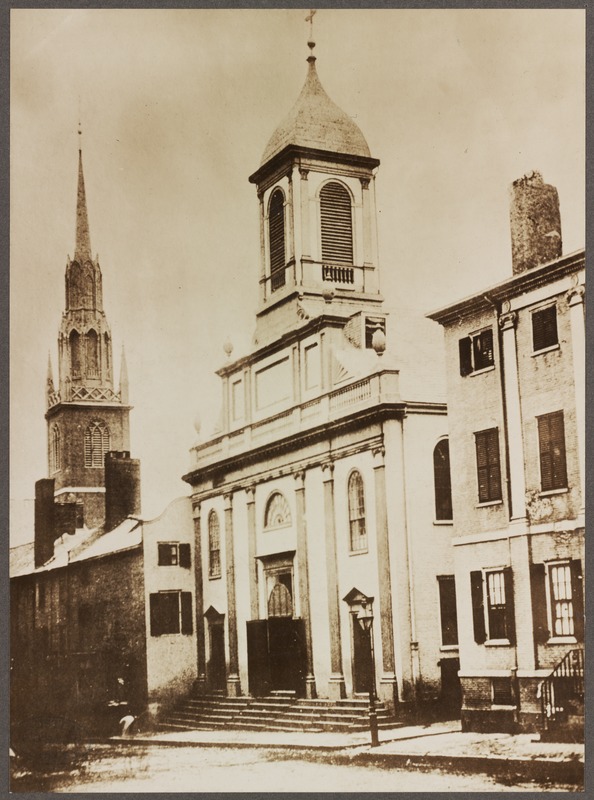 Architect: Charles Bulfinch. The only Gothic Revival style building designed by Bulfinch, it is located at today’s 145 Franklin Street. The church is demolished in 1859 and the congregation moves to a new building (fourth) in the Back Bay in 1861.*