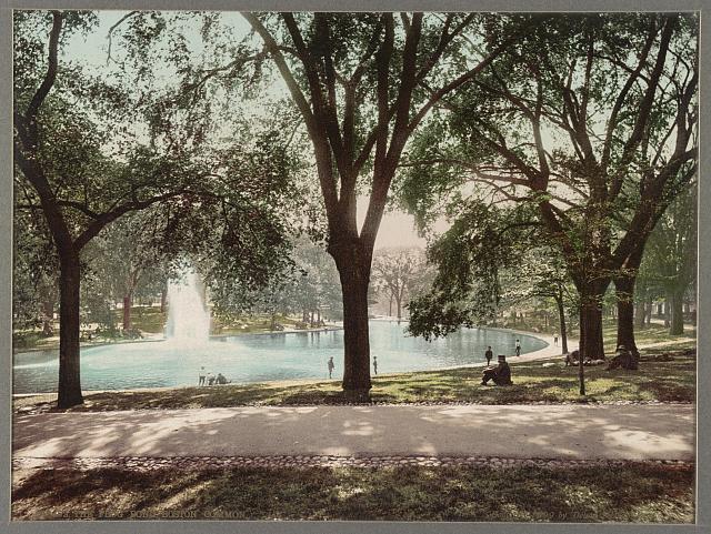 [1894-PV] Formerly a swampy area and described initially as a small mud hole, the pond is curbed in 1826 and paved in 1848. In 1872, Oliver Wendell Holmes advises, “Cherish it, inhabitants of the two-hilled city, once three-hilled: ye who have said to the mountain, ‘Remove hence,’ and turned the sea into dry land! For art thou not the Palladium of our Troy?” The pond serves as a swimming hole and skating rink, becomes a pray pool in the 1970s, and is renovated as a skating rink and reopens in 1997.*