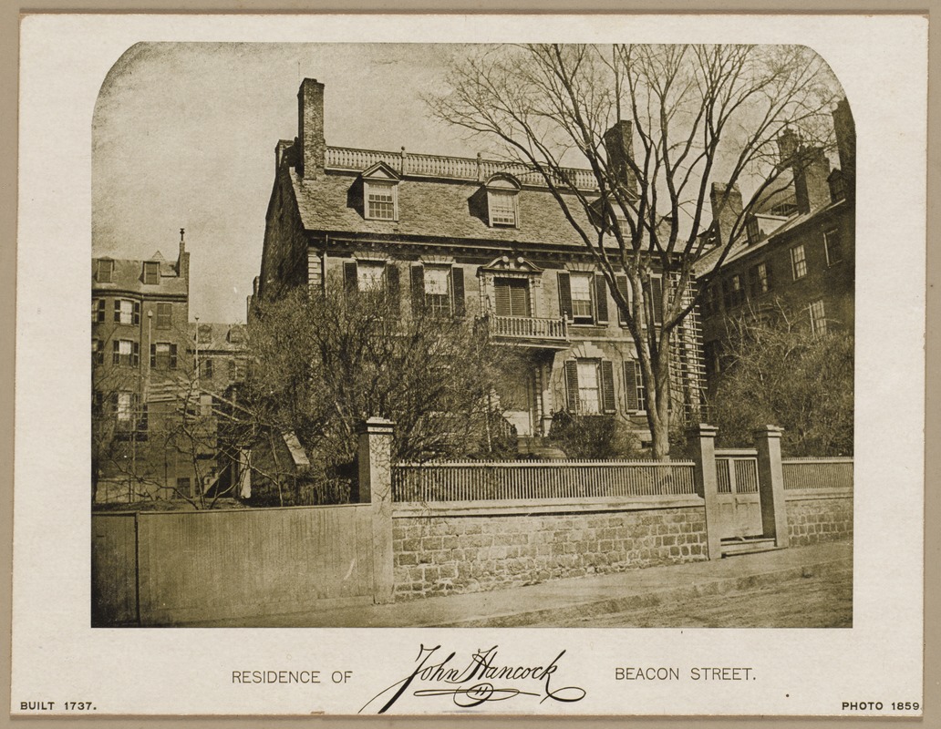 Architect: John James(?). Designed in the Georgian style and built for the town’s wealthiest merchant, it is located at 29 Beacon Street. The first granite house in Boston, it is inherited by nephew John Hancock, in 1764,* and occupied by British officers during the Siege of Boston. After the Evacuation of Boston, Hancock resumes residency and lives here until his death in 1793. George Washington is one of his visitors. Much of the property is bought by the state in 1795. Hancock’s widow lives in the house until 1816, and thereafter it becomes a boarding house. Despite one of the first preservation efforts in Boston history, the building is demolished to make way for construction of a new house in 1863.*