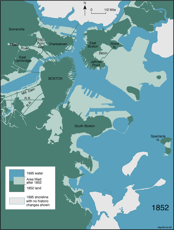 Courtesy of Bpl/Leventhal Map Center Map Works, Inc. Boston Shoreline. 1852 Created in 1999, the map is today part of the Leventhal Map Collection. Sources Leventhal Map Center Links Leventhal Map Center