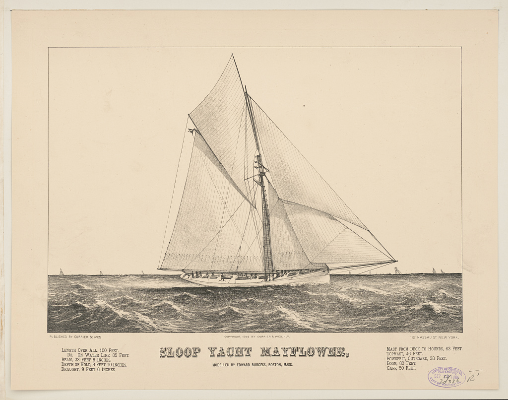 Launched from George Lawley and Sons’ shipyard at City Point in South Boston on May 6, 1886, the sloop is owned by group formed by Gen. Charles Paine, designed by Edward Burgess, and skippered by Martin Stone.
