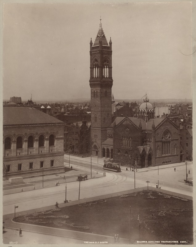 Architect: Cummings & Sears. Originally the Third Church in Boston (fourth) and known popularly as the New Old South Church, it is designed in the High Italian Gothic Revival style [Ruskinian Gothic style] and located at 645 Boylston Street. Built of Roxbury Puddingstone from the quarry on Parker Hill, the building’s exterior includes the likenesses of the architects in the figures carved into the piers that support the building’s porch. A 6,000+-pipe E.M. Skinner organ is installed in 1921. The Gordon Chapel is added in 1933. The tower, which begins to tilt almost as soon as it is built, is torn down to prevent its collapse and replaced by a smaller one in 1940. The interior is restored by Shepley Bulfinch Richardson Abbott in 1985.