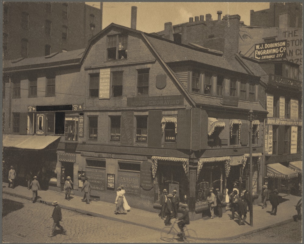 Operated by Richard B. Carter and Charles J. Hendee, it is located in the printing shop established the year before by Timothy Carter at today’s 3 School Street (283 Washington Street, then 135 Washington Street). The building becomes Ticknor & Fields publishing house in 1832,* the first home of The Atlantic Monthly magazine in 1857, and continues to serve as a bookshop until 1903. Threatened with demolition, the building is preserved by Historic Boston, Inc. in 1960,* renovated by Francis N. Cummings in 1964, and subsequently leased for commercial use. It is the home of the Globe Corner Bookstore from 1982 until 1997, and is today the headquarters of Historic Boston Inc.