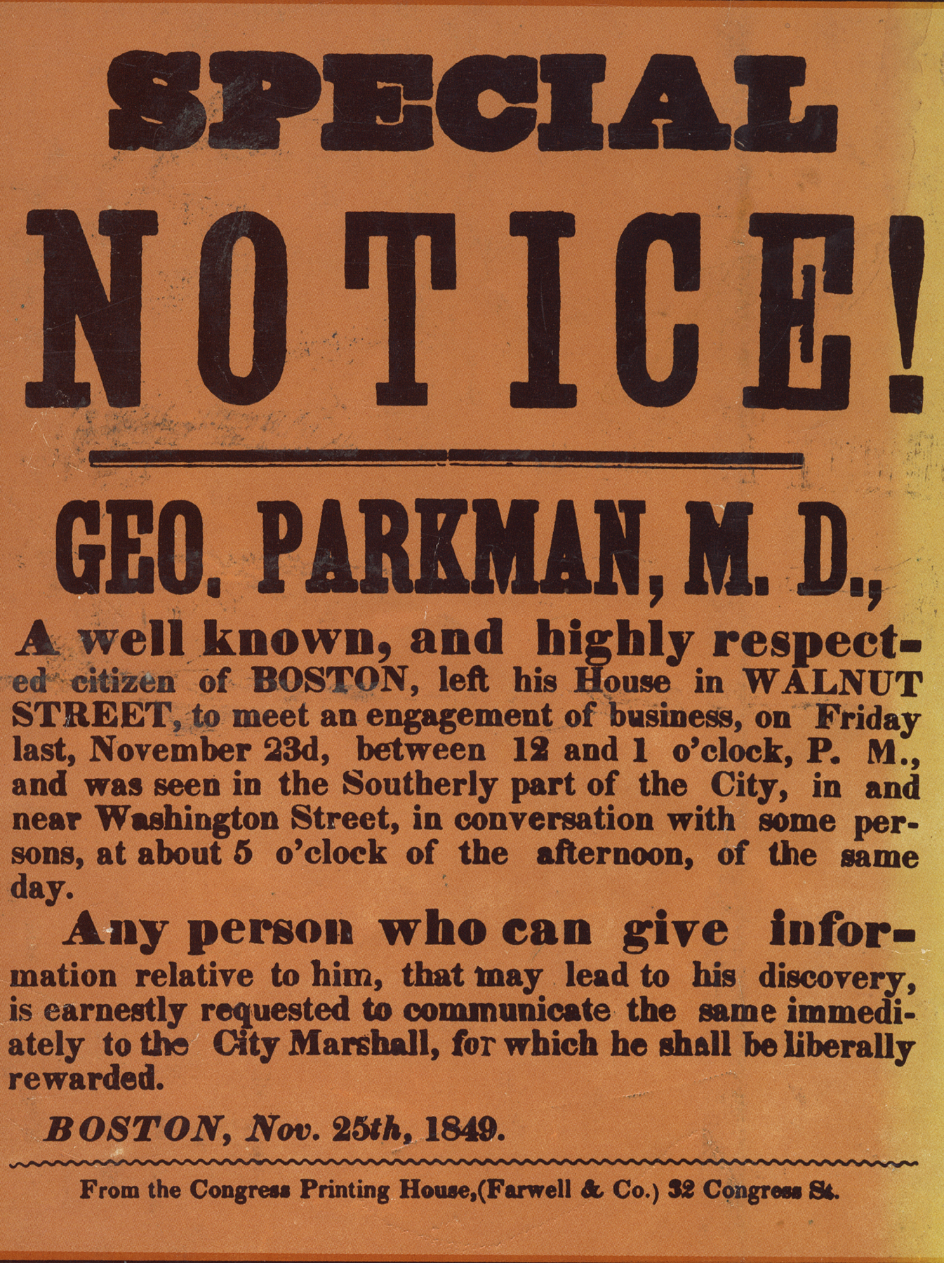 Shortly after breakfast, Dr. George Parkman leaves his home at 8 Walnut Street and is never seen again. After a manhunt during which police are told to bring in every Irishman with a dollar in his pocket, Dr. John White Webster is arrested for murder when traces of Parkman’s body are found in the drains below White’s laboratory at Harvard Medical School by janitor Ephraim Littlefield on Thanksgiving Day, November 29, 1849. The accusation against Webster prompts Harvard president Jared Sparks to declare, “Our Professors do not often commit murder.” Webster goes on trial in 1850.*