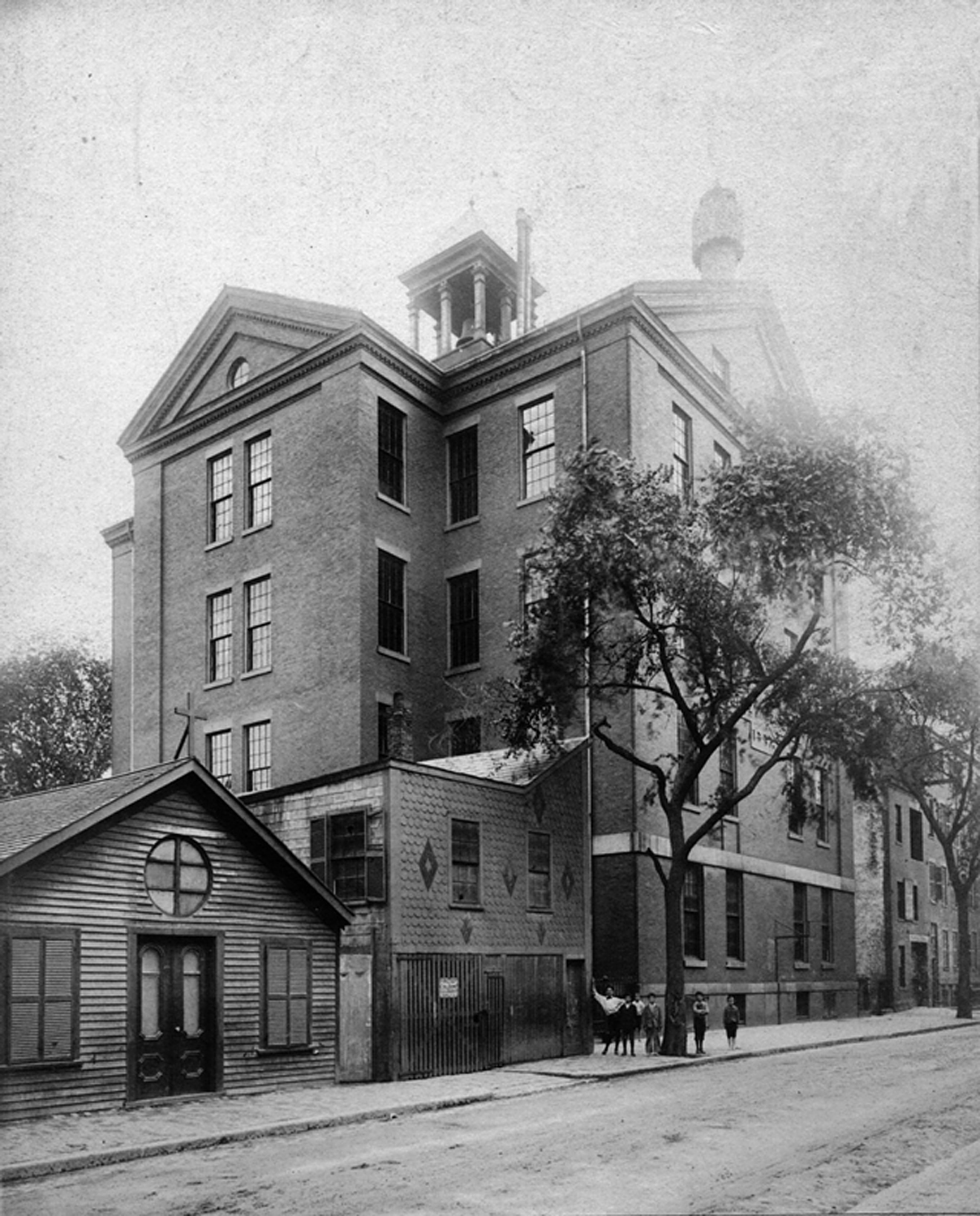 Architect: Gridley Bryant. Named for Boston’s second mayor, it is designed in the Greek Revival style and located at today’s 90 Tyler Street. Conceived by Horace Mann, it is subsequently described as “The first modern school in America.” It is the first graded middle school and the first school in which students are assigned seats in the U.S. Its first headmaster is John Philbrick, is said to have “drastically reduced punishment by whipping, and added drawing and music to the curriculum.” Destroyed by fire on December 17, 1848, the school is rebuilt (second) on the same site in 1849,* and replaced by a new building (third) on Washington Street. The original building becomes a Chinese community center in 1976.*