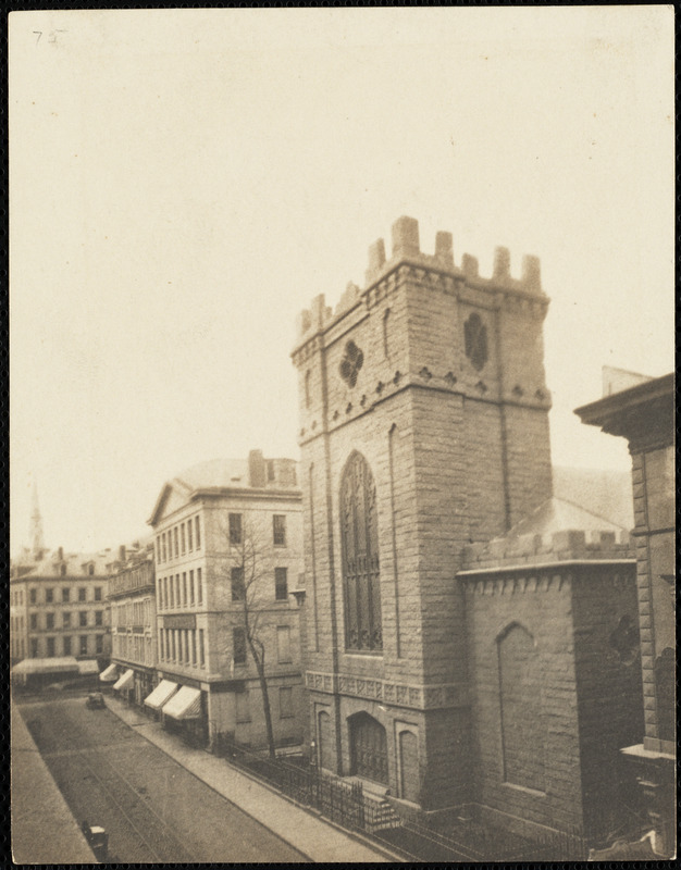 Architect: George Brimmer. Designed in the Gothic Revival style, it is located near today’s 26 Summer Street. The stone building is destroyed in the Great Fire of 1872. Four years earlier, however, the bishop of Massachusetts wrote that the church needed to move because “business had moved up from the harbor; blocks and shops surrounded the church; dwelling houses had been torn down and gardens desolated. Most of the parishioners had moved . . . [and] the church and such equipment as there was were unattractive and inconvenient.” After meeting in Huntington Hall for five years, a new church building (third) is erected in 1877.* Phillips Brooks serves as pastor from 1869 to 1891.
