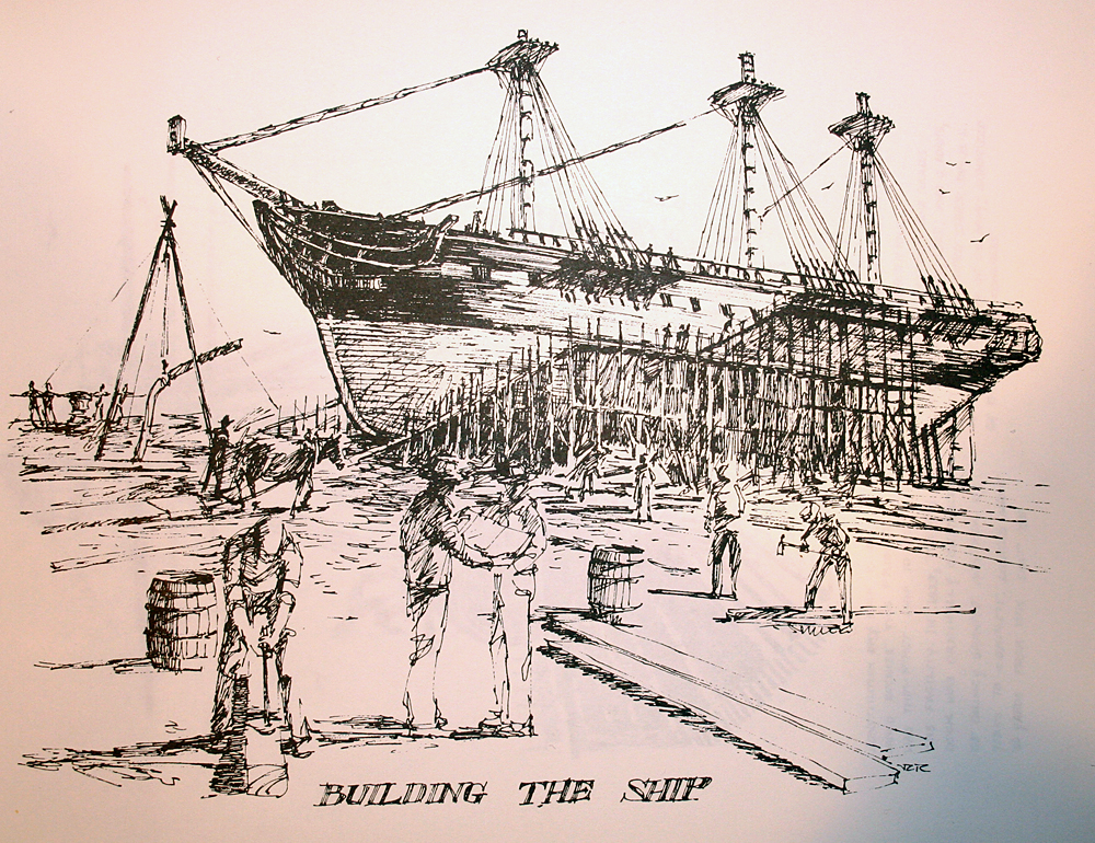 Subsequently known as “Old Ironsides” it is built by Joshua Humphreys and launched from Edmund Hartt’s Shipyard at today’s Constitution Wharf at 408 Commercial Street. Its sails were made in the Town Granary and its 11-story masts are the tallest structures in Boston. Samuel Nicholson is its first captain. The oldest commissioned battle ship afloat in the world, it wins all its 42 battles and earns its nickname in a battle in 1812.* The ship circumnavigates the earth from 1844 to 1851, is decommissioned in 1855, and is saved from being scrapped in 1830.* It is converted training ship and then a barracks ship at the Portsmouth Navy Yard, returns to Boston in 1897,* and serves as a Naval museum at the the Charlestown (then Boston) Navy Yard from 1909 to 1925, when a campaign to restore the ship is begun.