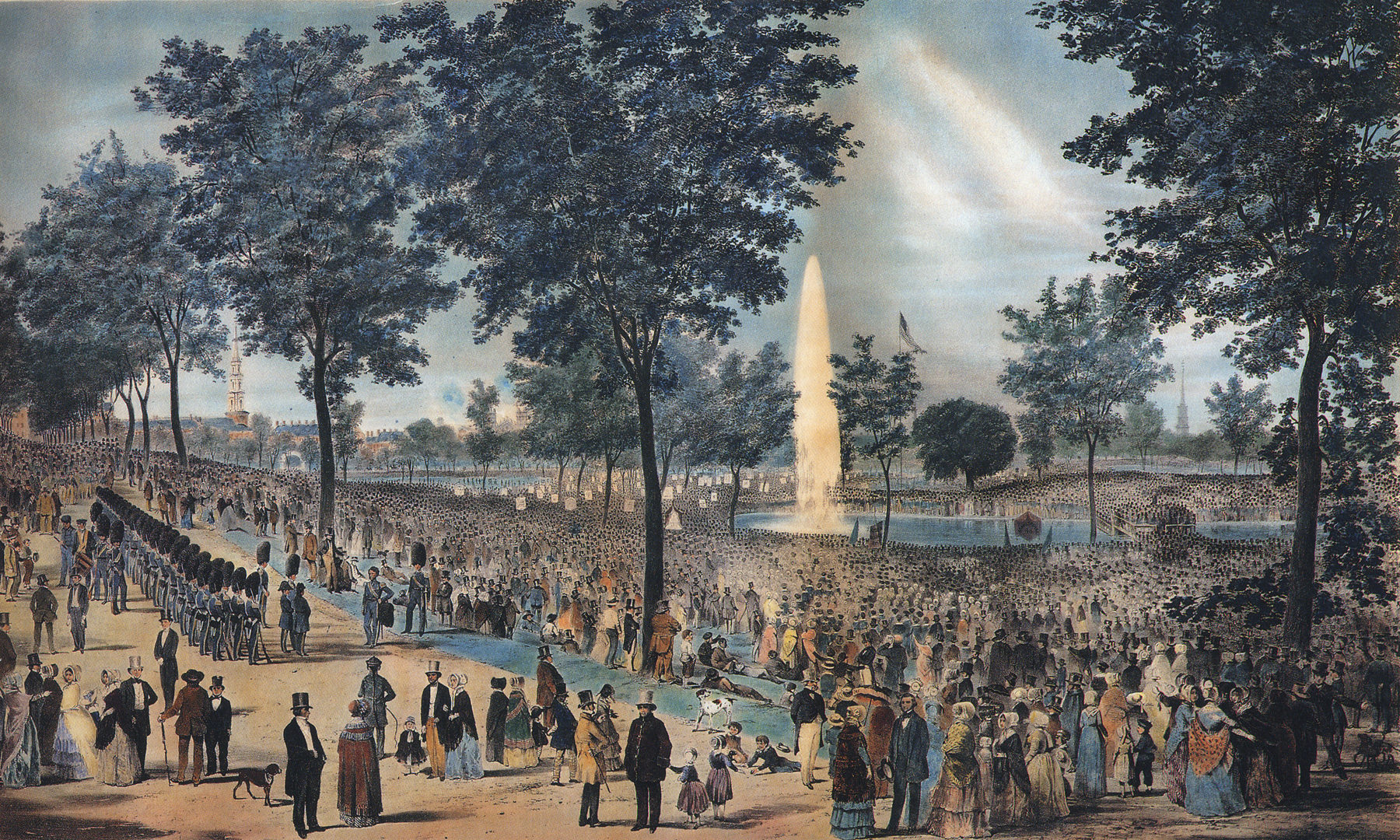 The event, which celebrates the opening of Boston’s municipal water system, attracts some 100,000 to people Boston Common. It begins with the ringing of church bells and firing of canons, and continues with Mayor Josiah Quincy asking the crowd, “Do you want water?” to which it answers “Yes!” Quincy then opens a sluice that results in a plume of water rising 80 feet into the air from the Frog Pond. The event also includes a parade, featuring 14 tablets describing the history of bringing water to Boston, that passes through a Moorish arch opposite the Boston Museum on Tremont Street, as well as speeches and fireworks and the illumination of houses.