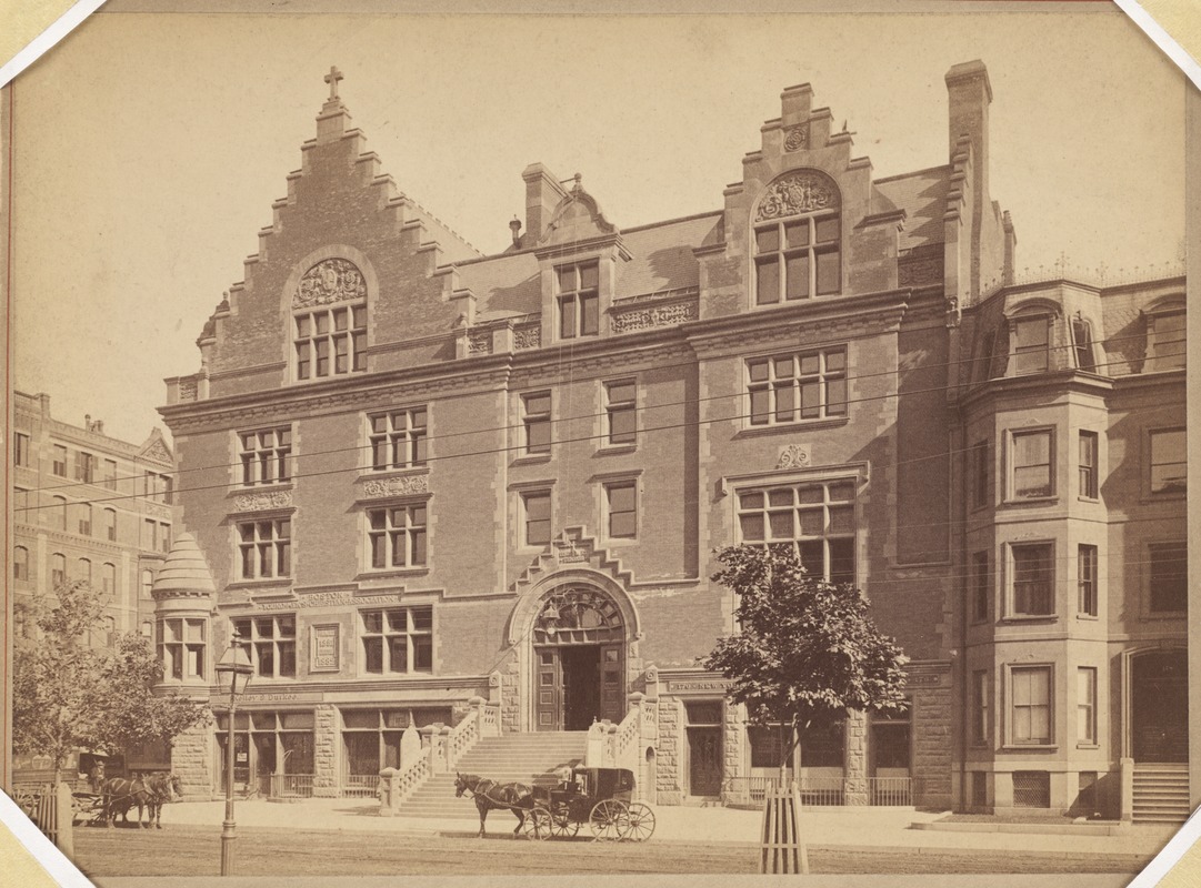 Architect: Sturgis & Brigham. Notable for its round turret, the building is located at 462 Boylston Street. The building is destroyed by a fire in the early 1900s, and the organization moves to its current building (fifth) in 1912.*
